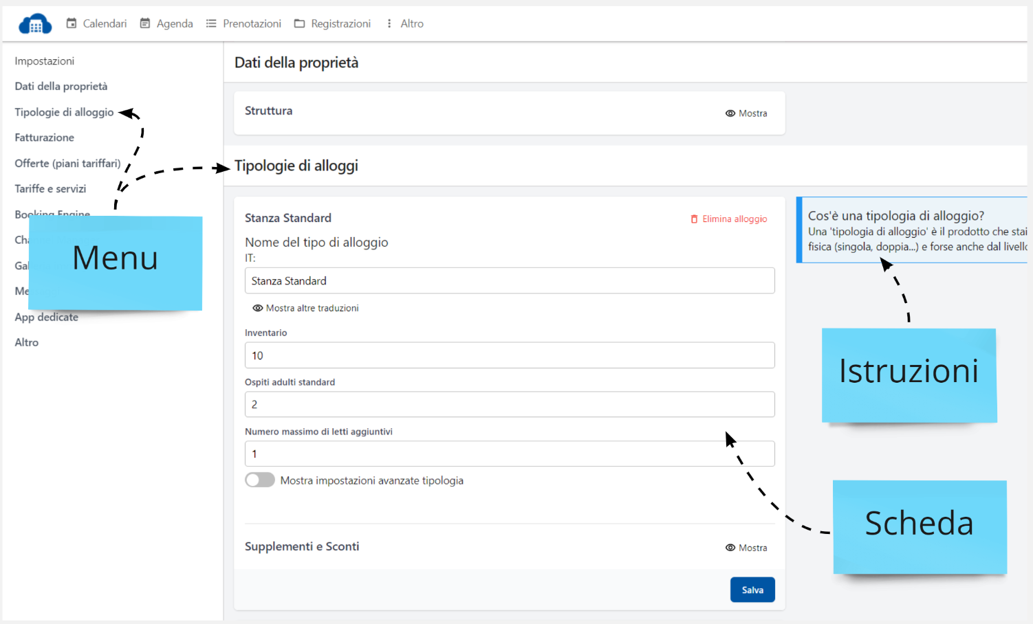 Ogni scheda permette di configurare le funzionalità di Hotel in Cloud.