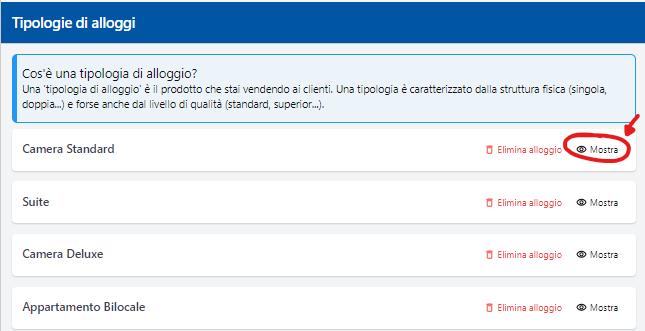 Dunque procedete da Altro>Configurazione>Tipologie di alloggi, e premete "mostra" sulla tipologia di alloggio da collegare: