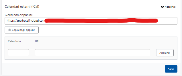 Per ESPORTARE il calendario della singola tipologia sull'OTA (dunque per comunicare le disponibilità che avete in Agenda su Hotel in Cloud) premete, subito sotto al link che trovate, il tasto "copia negli appunti" per copiare tutto il link, e successivamente dovete copiarlo nella sezione dedicata al collegamento iCal, dell'Ota a cui volete interfacciarvi.
