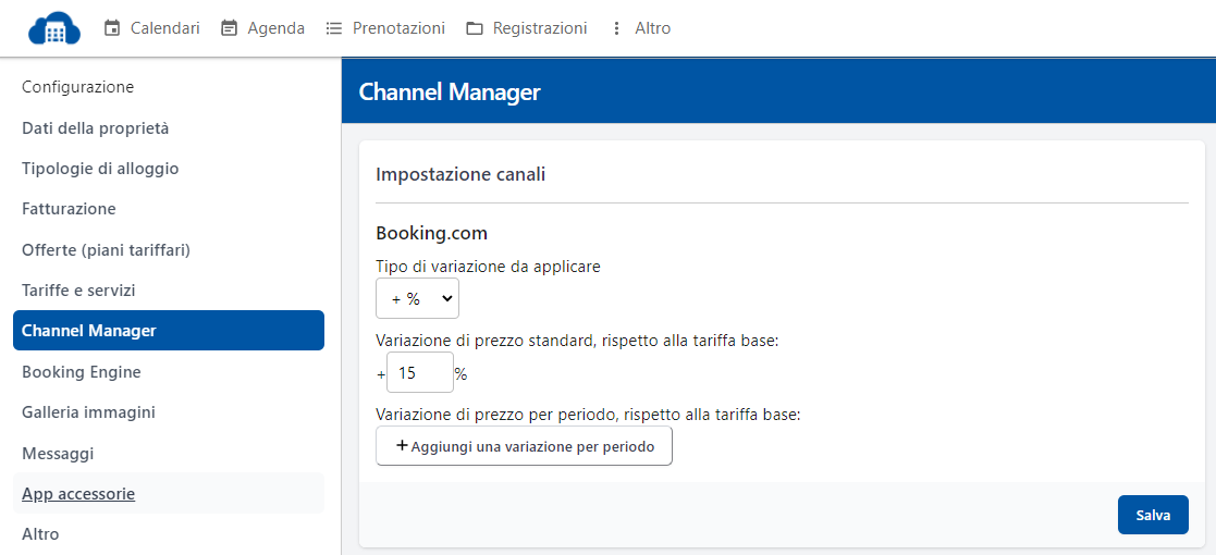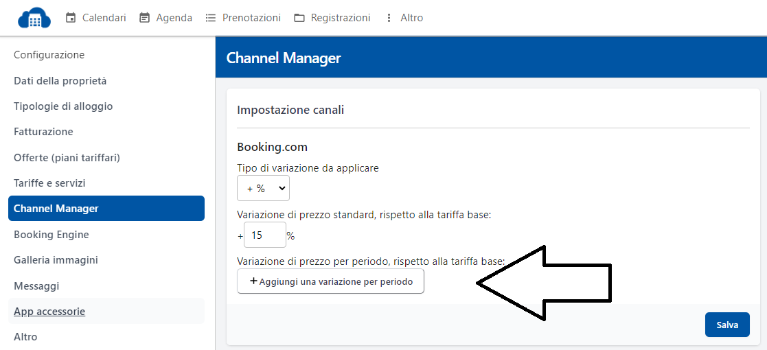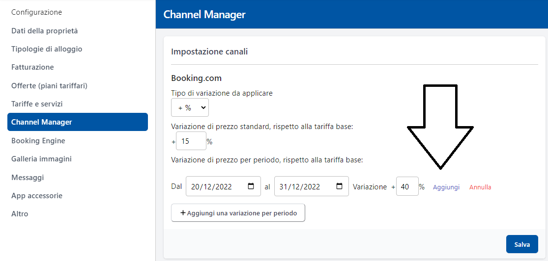 Dalla pagina Configurazione→ sezione Channel Manager → clicca su Aggiungi una variazione per periodo: