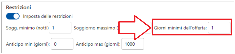 Il campo Giorni minimi dell'offerta serve a definire quanti giorni devono avere in comune la prenotazione e il periodo di validità affinché l'offerta venga visualizzata.