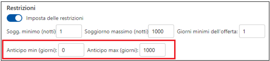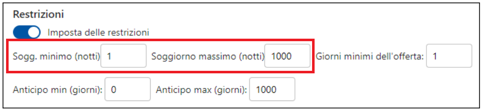 Puoi impostare che l'offerta sia visualizzabile solo per un determinato soggiorno minimo e/o soggiorno massimo attivando l'opzione Restrizioni e utilizzando i relativi campi: