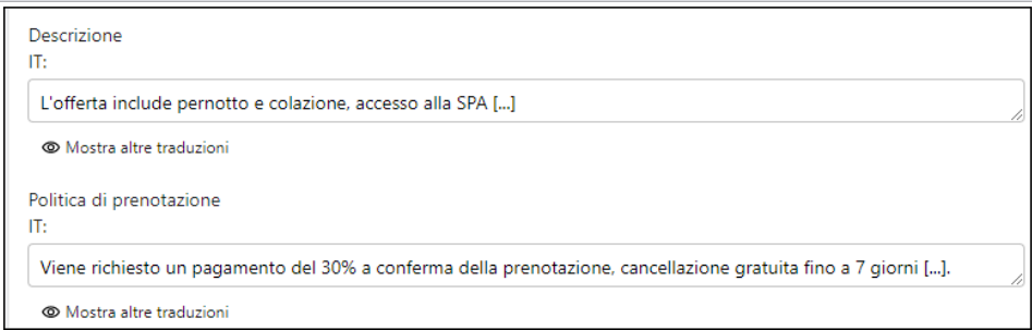 Nel campo descrizione puoi inserire una breve descrizione dell'offerta, ad esempio cosa include. Nel campo politiche di prenotazione invece devi definire le politiche di prenotazione e cancellazione dell'offerta, specificando ad esempio il pagamento richiesto, la rimborsabilità, la cancellazione gratuita fino a X giorni e così via.