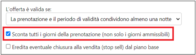 Quindi, nel caso in cui la prenotazione non sia interamente all'interno del periodo di validità dell'offerta, con questa spunta definisci se scontare tutti i giorni della prenotazione o solo quelli interni al periodo di validità.