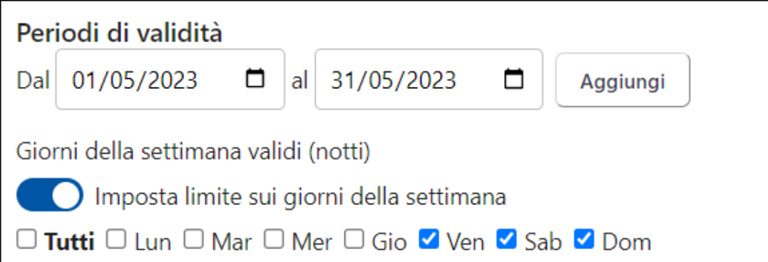 Esempio: l'offerta "Weekend di Maggio" deve essere attiva tutti i weekend del mese di maggio, quindi definisci il periodo di validità 01/05 - 31/05 e attivi il limite sui giorni della settimana per ven-sab-dom.