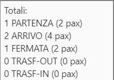 In fondo alla sezione liste, trovi un riassunto di arrivi, partenze, fermate e trasferimenti della giornata selezionata: