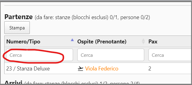 situazione: arrivo/partenza/permanenza, con accanto il numero di ospiti, e tra le parentesi il nome del prenotante;