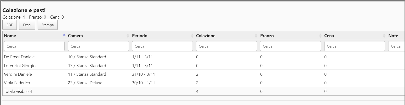 il totale mostrato in cima alla tabella, indica il totale dei pasti del giorno, mentre il totale mostrato in fondo alla tabella, si aggiorna in base ai filtri impostati nella tabella stessa, quindi se ad esempio filtro la tabella per vedere solo le camere standard, il totale in fondo conteggerà solo i pasti delle camere standard.