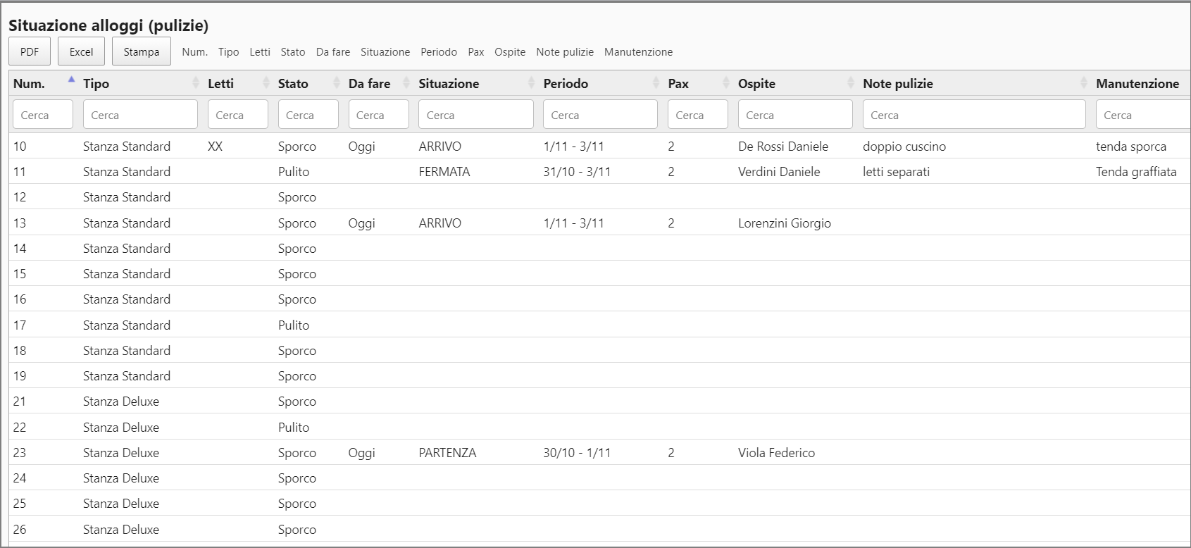Periodo: indica le date di check-in e check-out della prenotazione presente nella camera;