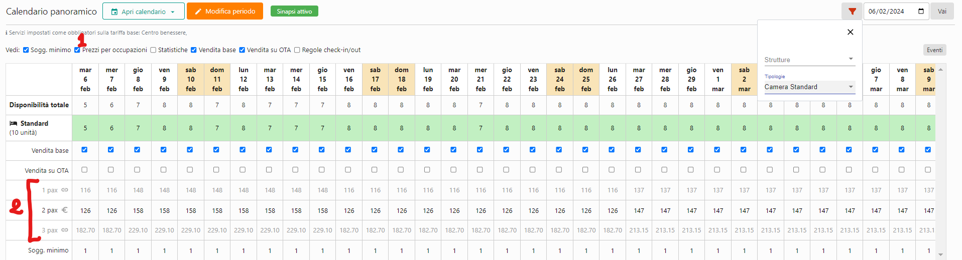 Per esempio, qui nella Figura 1, impostando la spunta alla voce "Prezzi per occupazione" (1) si può vedere come sul calendario il prezzo varii a seconda dei pax in esame (2).
