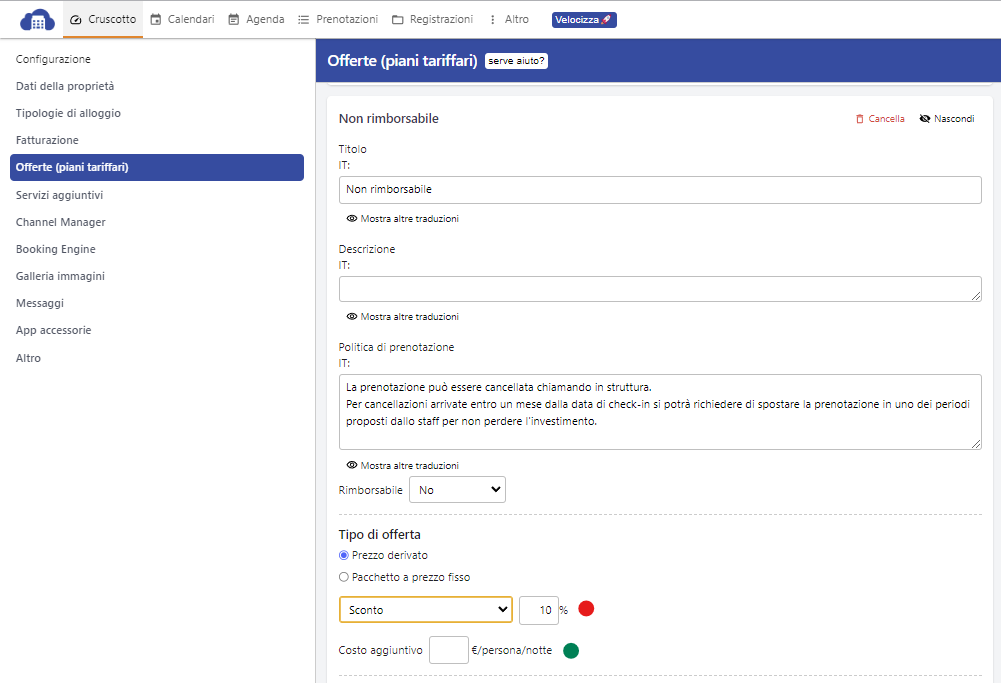 Nella configurazione dell'offerta base, oppure offerta standard, non viene richeisto di impostare alcun tipo di informazione inerente il prezzo, soltanto tutte le informazioni e impostazioni accessorie come trattamento, politiche di prenotazione, rimborsabilità, eventuale anticipo minimo, metodi di pagamento, ma queste sono tutte informazioni che esulano dallo scopo di questa guida. Qualora vorreste approfondirle nello specifico, si rimanda alla seguente guida: