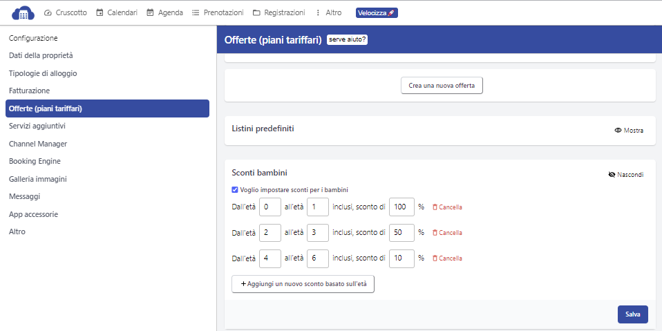 N.B.: Sconti bambini si applicano soltanto se questi rientrano come ospiti aggiuntivi, non se fanno parte degli ospiti standard. Per esempio numerico rimandiamo al paragrafo seguente Offerte (piani tariffari).