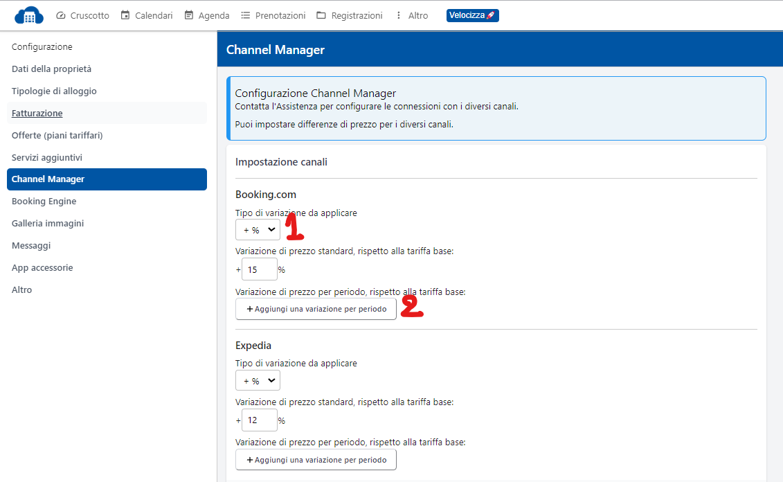 Un altro dato da controllare nella verifica di difformità prezzi tra gestionale e portali è la maggiorazione/minorazione che è stata impostata per lo specifico portale sempre in Configurazioni. Per verificarla bisogna andare nella sezione Channel Manager e visualizzare inannzi tutto se si tratta di una maggiorazione percentuale (+%) o nominale (+€), oppure di una minorazione percentuale (-%) o nominale (-€) (1), o se ci sono intervalli di periodo in cui tale modifica rispetto al prezzo impostato sul calendario si modifica (2).