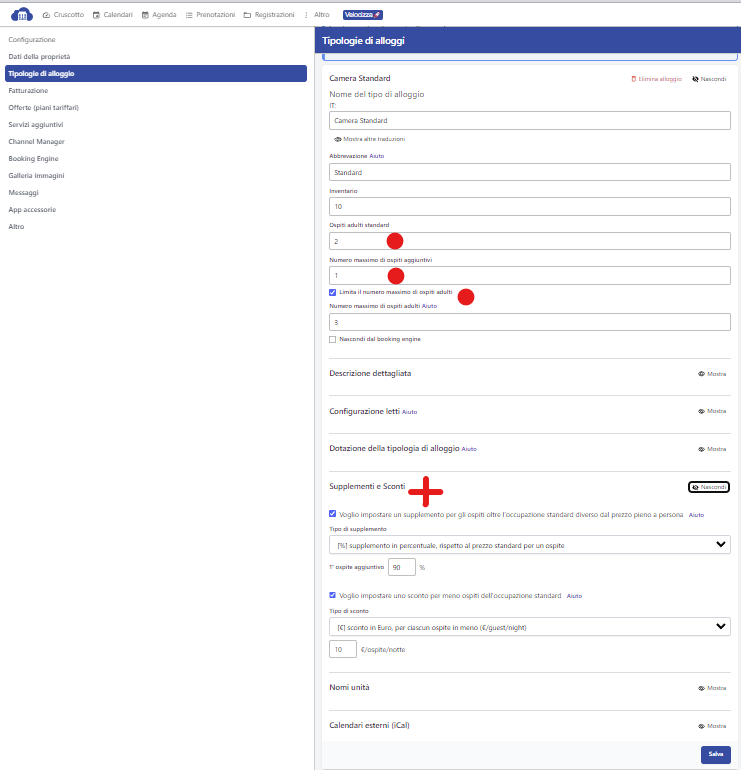 La prima informazione che dobbiamo verificare è appunto com'è stata configurata l'occupazione standard della tipologia in esame, se prevede ospiti aggiuntivi, e infine se sono stati impostati supplementi/sconti e di quale entità.