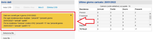 Disallineamento bloccante: se c’è un disallineamento bloccante, il sistema ISTAT vi avvisa specificando quali ospiti causano l’errore. Esempio: si stanno dichiarando 5 partenza da Genova ma sono presenti solo 3 ospiti da Genova, quindi si stanno dichiarando partenze di più ospiti di quanti ce ne siano.