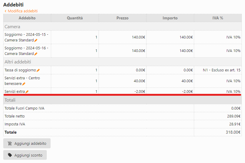 Infine premendo "Applica sconto" (4) verrà aggiunto un addebito in negativo nella tabella degli addebiti totali che saranno presenti nel documento.