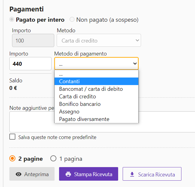 7. Nella creazione della ricevuta, potrai scegliere come viene pagato il resto del documento e poi cliccare su 'Stampa ricevuta' (come al solito)