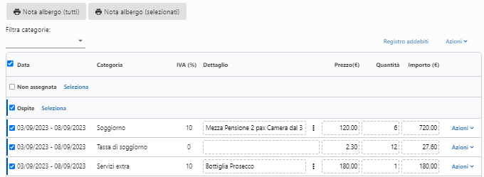 Altrimenti, per inserire solamente gli addebiti selezionati (spuntati): Nella sezione Addebiti clicca su Nota albergo (selezionati).