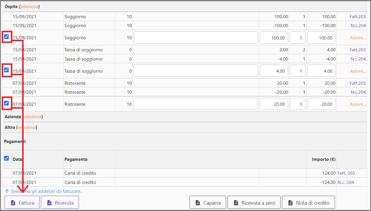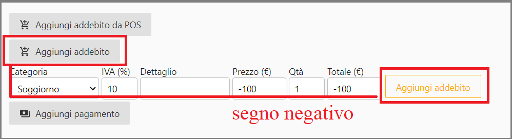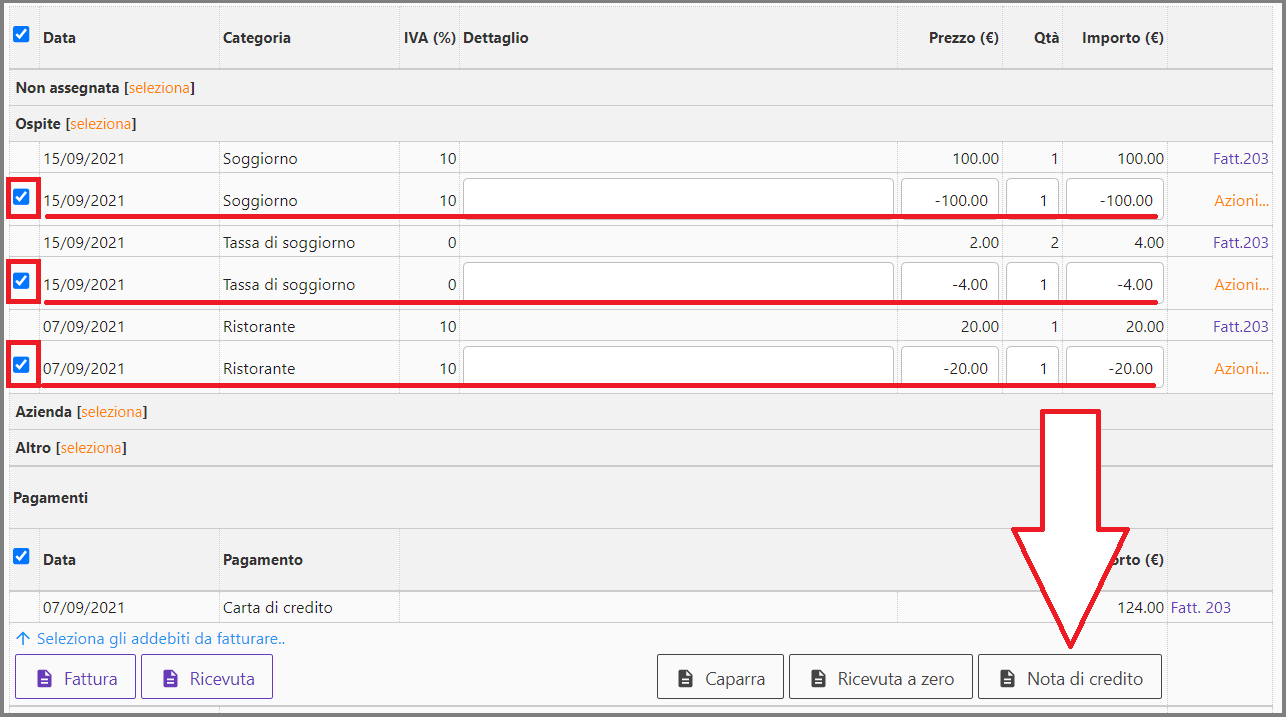 Quindi se, ad esempio, devi emettere la nota di credito per una fattura di € 100,00 di soggiorno, € 4,00 di tassa di soggiorno, e € 20,00 di Ristorante, devi creare: