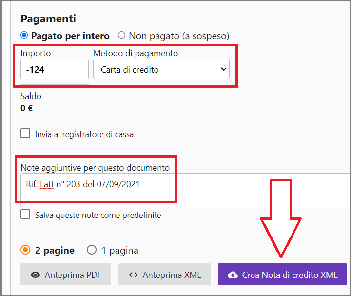 Metodo di pagamento della nota di credito: inserisci il metodo di pagamento utilizzato per il rimborso della fattura da stornare (oppure non pagato, se la fattura non era stata ancora pagata e quindi non serve alcun rimborso).