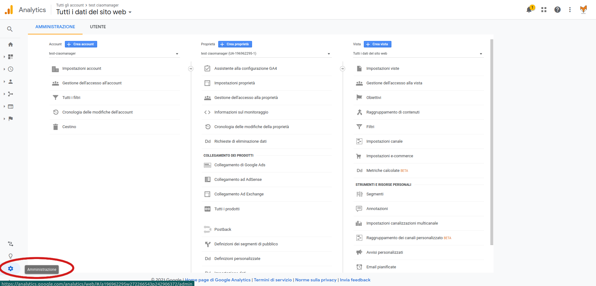 Una volta creata una proprietà in Google Analytics troverai il codice di tracciamento nella pagina https://analytics.google.com/, cliccando in fondo a sinistra sulla voce "Amministrazione":