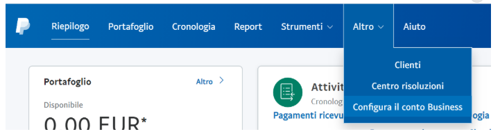 Dopo aver fatto l'accesso al tuo conto PayPal, apri il menù Altro → Configura il conto Business: