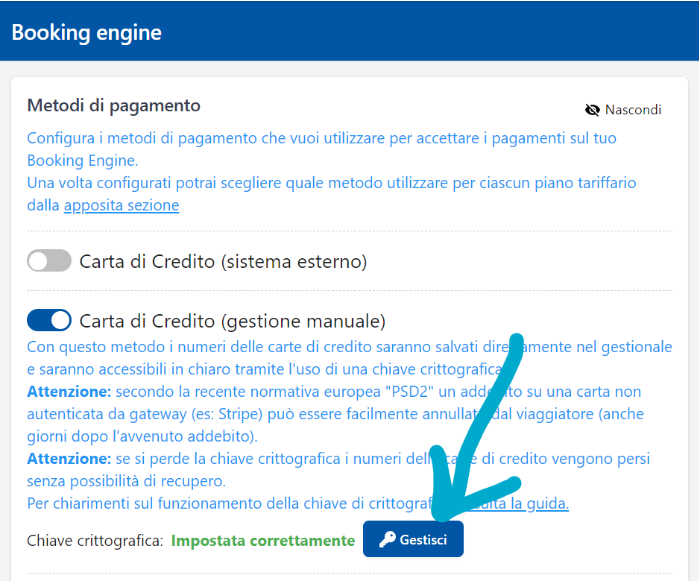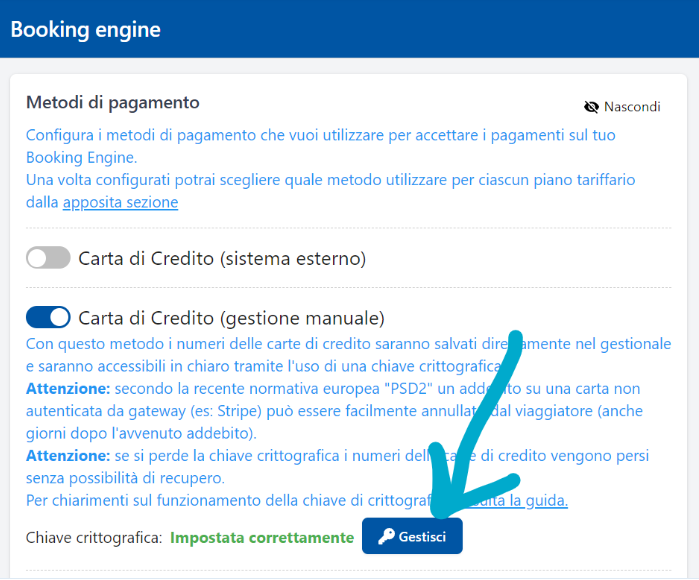 Per rigenerare la chiave crittografica vai da Altro > Configurazione > Booking Engine > Metodi di pagamento, sezione Carta di Credito (gestione manuale) e clicca su Gestisci: