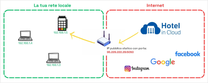 🧑🔧 Al tuo amministratore di rete chiedi quindi: l'indirizzo IP pubblico statico, e la porta da dedicare alle comunicazioni provenienti da Hotel in Cloud.