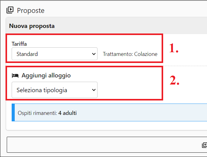 Una volta selezionata la tariffa ("1." in img), puoi selezionare l'alloggio/gli alloggi da includere nella proposta ("2" in img). Verranno mostrati solo gli alloggi disponibili per quella tariffa in quel periodo.