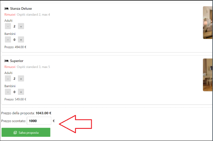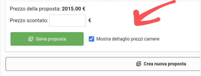 Quando tutti gli ospiti previsti dal preventivo risultano assegnati ad un alloggio, puoi indicare il prezzo scontato della proposta, subito sotto al prezzo complessivo della proposta stessa. Poi, clicca su 'Salva proposta'.