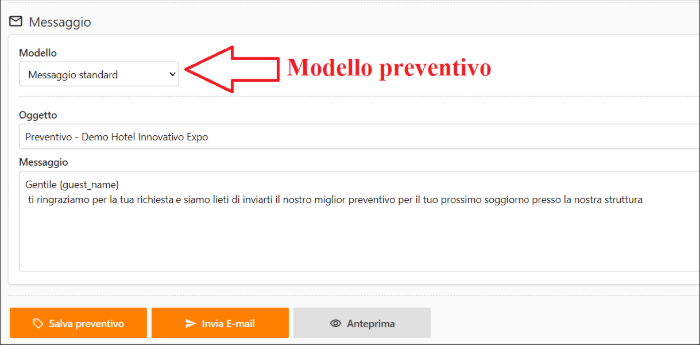 In cima alla sezione, puoi selezionare il modello da richiamare. Potrai comunque intervenire manualmente per personalizzare il testo (per la creazione/modifica dei modelli email, consulta la nostra guida Come creare/modificare i modelli email)