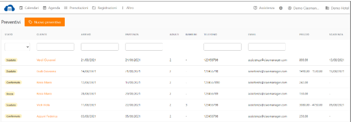 Puoi cercare un qualsiasi preventivo precedentemente creato/inviato, da 'Altro', 'Preventivi'. Per ricercare un determinato preventivo, puoi utilizzare i filtri presenti in cima alle colonne STATO, CLIENTE, ARRIVO, PARTENZA, TELEFONO ed EMAIL.