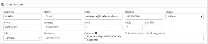 Dati generali: nome, cognome, check-in/out, scadenza, ecc
