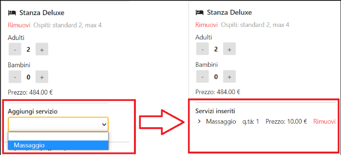 Se sono configurati dei servizi aggiuntivi, puoi aggiungere anche questi alla prenotazione di ogni alloggio. Il prezzo viene calcolato in base alle impostazioni del servizio (es. prezzo/persona/notte):