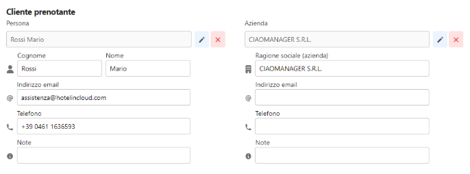 Qui è possibile modificare dati già esistenti o aggiungere dati ulteriori al cliente prenotante (persona o azienda).