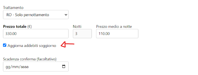 Ed inoltre di Default sarà attiva questa spunta "Aggiorna addebiti soggiorno", che creerà in automatico un addebito per l'importo aggiuntivo derivante dalle notti extra che verranno inserite.
