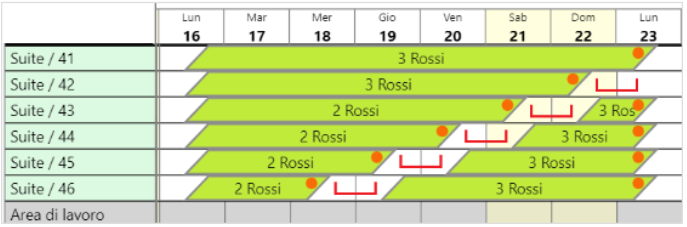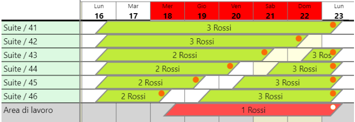 Le prenotazioni segnalate in rosso, anche se in area di lavoro, contano comunque per il calcolo della disponibilità, quindi nel caso dell'immagine qui sopra, la disponibilità nei giorni dal 18 al 23 sarà zero, e di conseguenza non avrò più camere in vendita.