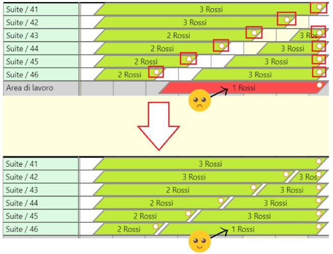 In alternativa puoi sempre trascinare le prenotazioni riorganizzandole manualmente.Nel caso dell'esempio, ecco cosa accadrebbe in automatico grazie al sistema RoomTetris.