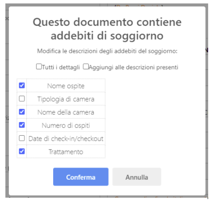 NB: il dettaglio degli addebiti di categoria "Soggiorno" verrà automaticamente sovrascritto con i campi selezionati in questo pop-up, a meno che non venga selezionata la spunta "Aggiungi alle descrizioni presenti".