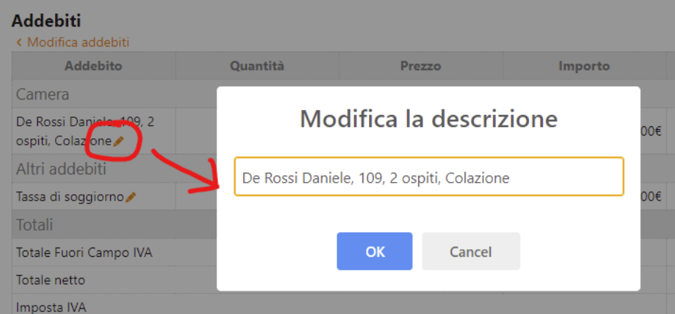 Un'altra funzione che si attiva con questo modulo, è la possibilità di modificare il testo degli addebiti in fase di emissione dei documenti fiscali, cliccando sulla "matitina arancione".