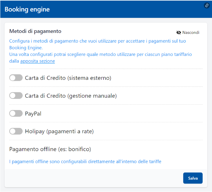 Se volete attivare i pagamenti online automatici, potete attivare e collegare a Hotel in Cloud un servizio di pagamenti online integrato, come Stripe o NEXI.