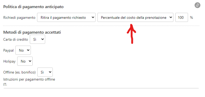 Come mostrato più nello specifico nella guida Attivazione e metodi di pagamento (qui il link: https://guide.hotelincloud.com/it/articles/6856090-attivazione-e-possibilita-metodi-di-pagamento), è possibile abilitare le transazioni online per ciascuna offerta, specialmente la richiesta di pagamento anticipato in fase di creazione della prenotazione, da Altro > Configurazione > Offerte (piani tariffari) > nella sottosezione mostrata qui di seguito.