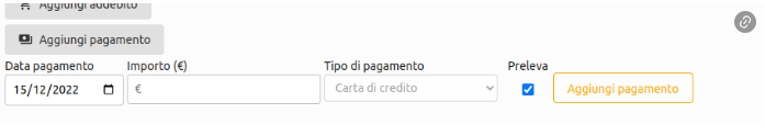 Se la prenotazione ha una CC virtuale collegata (registrata tramite Stripe), nella maschera della prenotazione stessa bisogna andare nella sezione Addebiti e premendo sulla funzione "Aggiungi pagamento" (che trovate sotto la lista degli addebiti della prenotazione) va compilato il pagamento inserendo l'importo e -come tipo di pagamento- Carta di Credito, infine va spuntata la cella "Preleva". Così facendo il sistema, una volta confermata l'operazione premendo il tasto "Aggiungi pagamento", preleverà automaticamente l'importo inserito dalla CC registrata su Stripe.