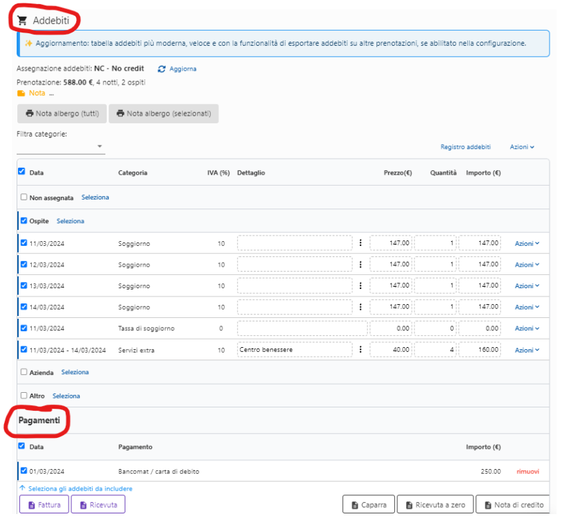 I pagamenti invece sono legati agli addebiti, ma non servono a fini fiscali, servono soltanto alla struttura per fare cassa. Infatti si possono creare documenti fiscali con metodo di pagamento: Non pagato.